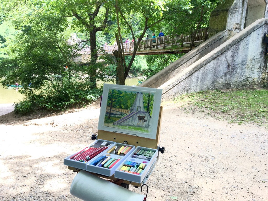 For a couple of hours I painted part of the dam built in the 1920s as well as the upper and lower fossil beds created 387 million years ago when corals, sponges, brachiopods and other aquatic life flourished under a shallow tropical sea and were buried in layers of limey sediment that caused them to fossilize. During the glacial retreat of the last Ice Age meltwater scoured the limestone deposits, exposing the Devonian fossil beds and providing a marvelous look at prehistoric life forms preserved in stone for the modern-day visitor.