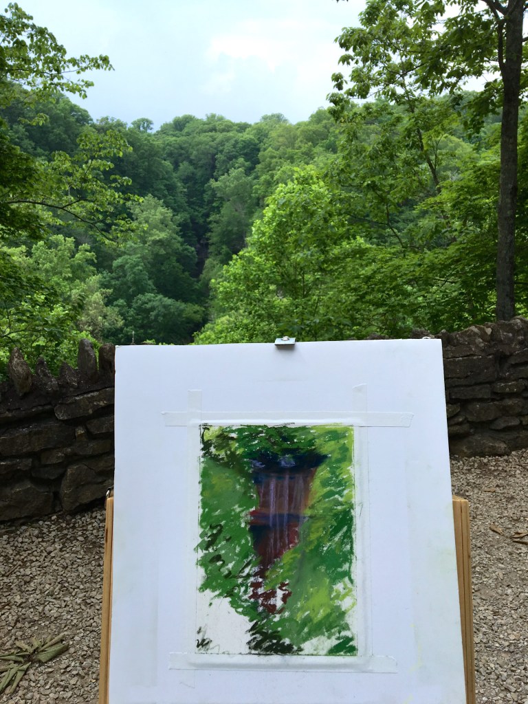 Despite all the moisture I chose to try my hand at some pastel work while chatting with curious visitors who peered around my easel to see what I was doing. Before the visit I had prepared a piece of sanded pastel paper, cut to a small standard size and taped to some foam board for stability. That way I could secure the painting surface by clipping it to my pochade paint box like any other canvas. The danger with pastels is always the possibility of knocking costly pastel sticks to the ground and breaking them but I managed to keep them steady for a quick impression of the falls before the skies finally opened up. I then took the work in progress home to finish in drier conditions.