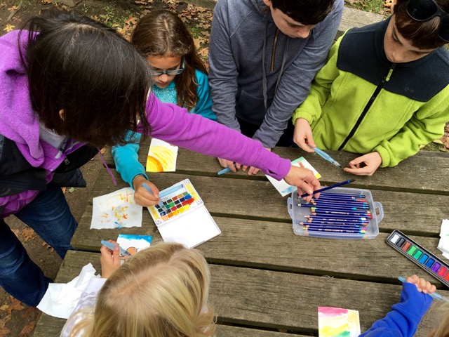 We had a tremendous turnout that day with 66 children and grownups participating in our painting activity, rivaling the attendance at O’Bannon Woods State Park on a Labor Day weekend two years ago. You could find artists everywhere including the Nature Center’s outdoor benches by the overlook, the porch floor and in the gravel path! Even a brief rain shower couldn’t deter visitors from trying out the water brushes and art supplies. We were really happy with our Art in the Park program’s outreach on the final park visit and the smiles on visitors’ faces made the ambitious schedule and 23 painting activities all worthwhile.